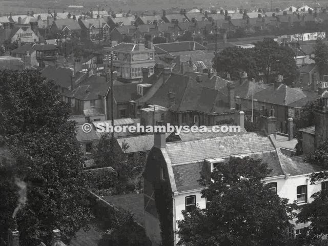 GH17 – York Lodge, Southdown Road 1910. York Lodge was the home of the Eade family and next door at ‘The Elms’ was George Frederick Harker who had inherited his father’s ironmonger’s business in the High Street. Arthur Eade and George Hedgecock had known each other since their cycling days – Florence Harker, George Harker’s daughter, was one of Shoreham’s earliest lady cyclists and may well be in this picture. George Hedgecock is seated on the right with his wife, Caroline, behind him. Arthur Eade is next to George. Seated third from the left is thought to be George Harker – Lilian Hedgecock is sitting at the front with her brothers Tim (next to her) and Reg on the right.