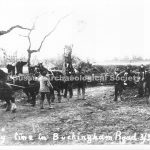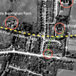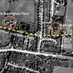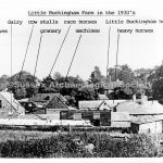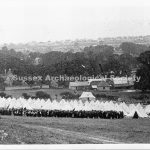 Another view of army tents in 1914 looking south towards Little Buckingham farm. The light spot to the right by the trees is Little Buckingham pond. The large building is the machinery barn.A view of army tents in 1914 looking south towards Little Buckingham farm. The light spot to the right by the trees is Little Buckingham pond. The large building is the machinery barn.