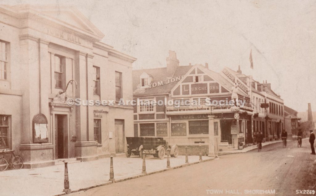 Anyone who has visited Shoreham will have noticed the prominent pirate figurehead mounted high on the Crown and Anchor. As a youth I used to always drive down to Brighton along the more interesting seafront route long before the bypass, and that pirate was one of the curious milestones along with the junior Battersea power station, rows of coloured beach houses and dilapidated pier. It was an unbelievable surprise for me to find out 30 years later, after living in Brighton for a decade then Australia for two, that it was a long-lost relative who originally put it there. While researching the origins of my orphaned grandfather, I pieced together an amazingly colourful detailed story from the late nineteenth century which, on reflection, ends at the Crown below that pirate and various signs above the door and on even the roof reading “Tom Jones“