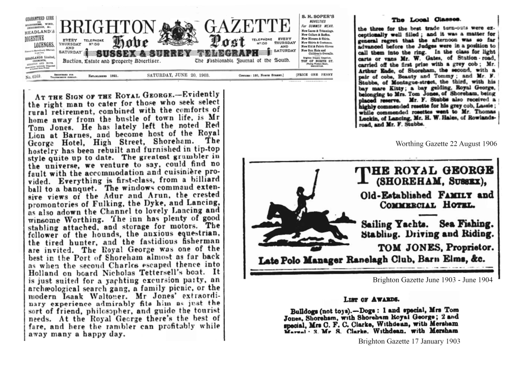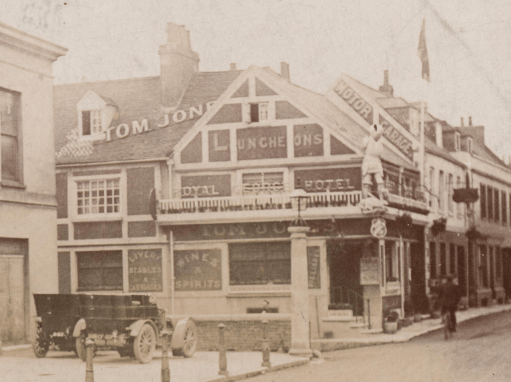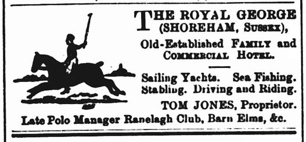 Tom did move on to Shoreham but he brought his sporting spirit intact. He and Eliza took over the Royal George, an old Tudor hotel next to the town hall, later demolished in the 1930s to straighten the road. He renovated it “in tip-top style quite up to date”, installing billiards tables, setting up his livery stables and a new motor garage with some of those early curious looking cars which appeared rather cheekily parked on the town hall frontage. He adorned the hotel with his name above the door, on the roof, on hanging shields and signs, and began posting adverts in the local newspapers with his familiar polo player logo and his ex-Ranelagh club credentials. He ran tourist activities on the beach, boating, horse riding and apparently was a fun host with many a story to tell.