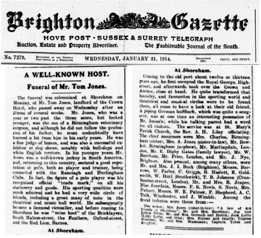 Tom became friends with Captain William Bareham, who perhaps assisted with his tourist boating trips. He was well known in Shoreham and in the 1980’s a newspaper article reported a visit by his granddaughter Daphne Vera Rosalind Pike who was named after the yacht Rosalind he captained a model of which can be found in Marlipins museum. She mentioned that Captain Bareham was friends with Tom Jones of the Crown and Anchor and showed them a photo of the pair together. Unfortunately the newspaper seems to have cropped Tom off, only showing his elbow! This doesn’t help much to narrow down his only other “where’s tommy” appearance in the Belsize Boxing Club photo. In 1907 Tom and Eliza moved up to the Crown and Anchor, where they would continue their business for another 7 years until his death.