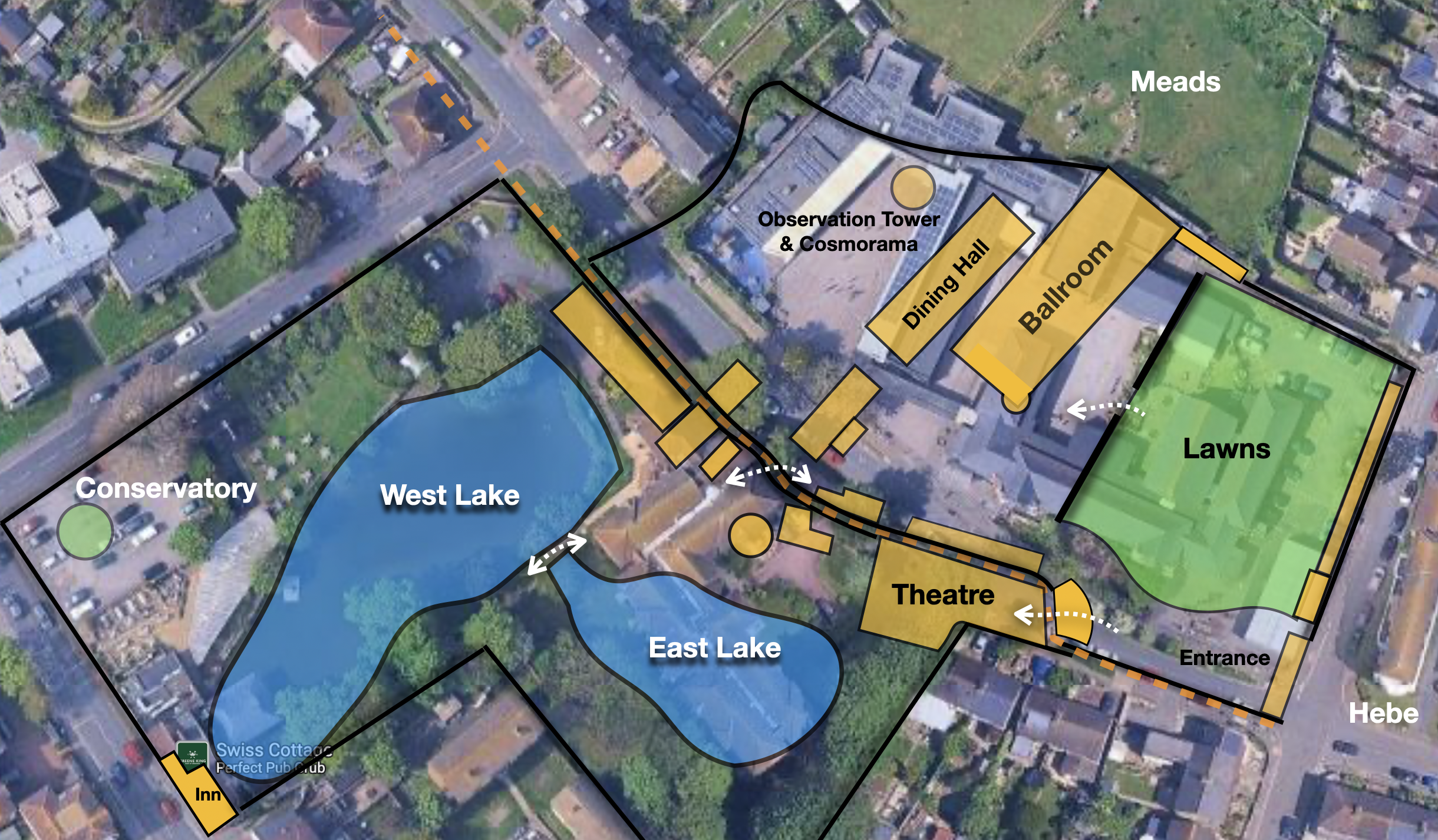 If you look closely there are a few clues to the former use of the Swiss Gardens School site – the Swiss Gardens pleasure garden (1838 – 1910). The Lake is the most obvious, to the South of Swiss Gardens road in the grounds of the Swiss Cottage pub. Hidden in the gardens of Homehaven Court is the remaining wall of the grand theatre.