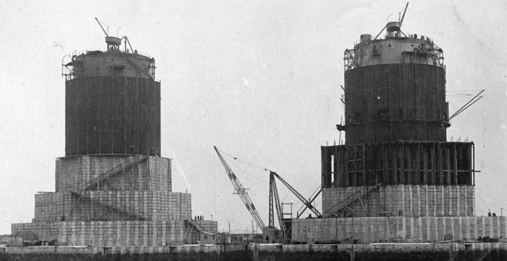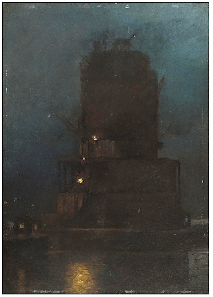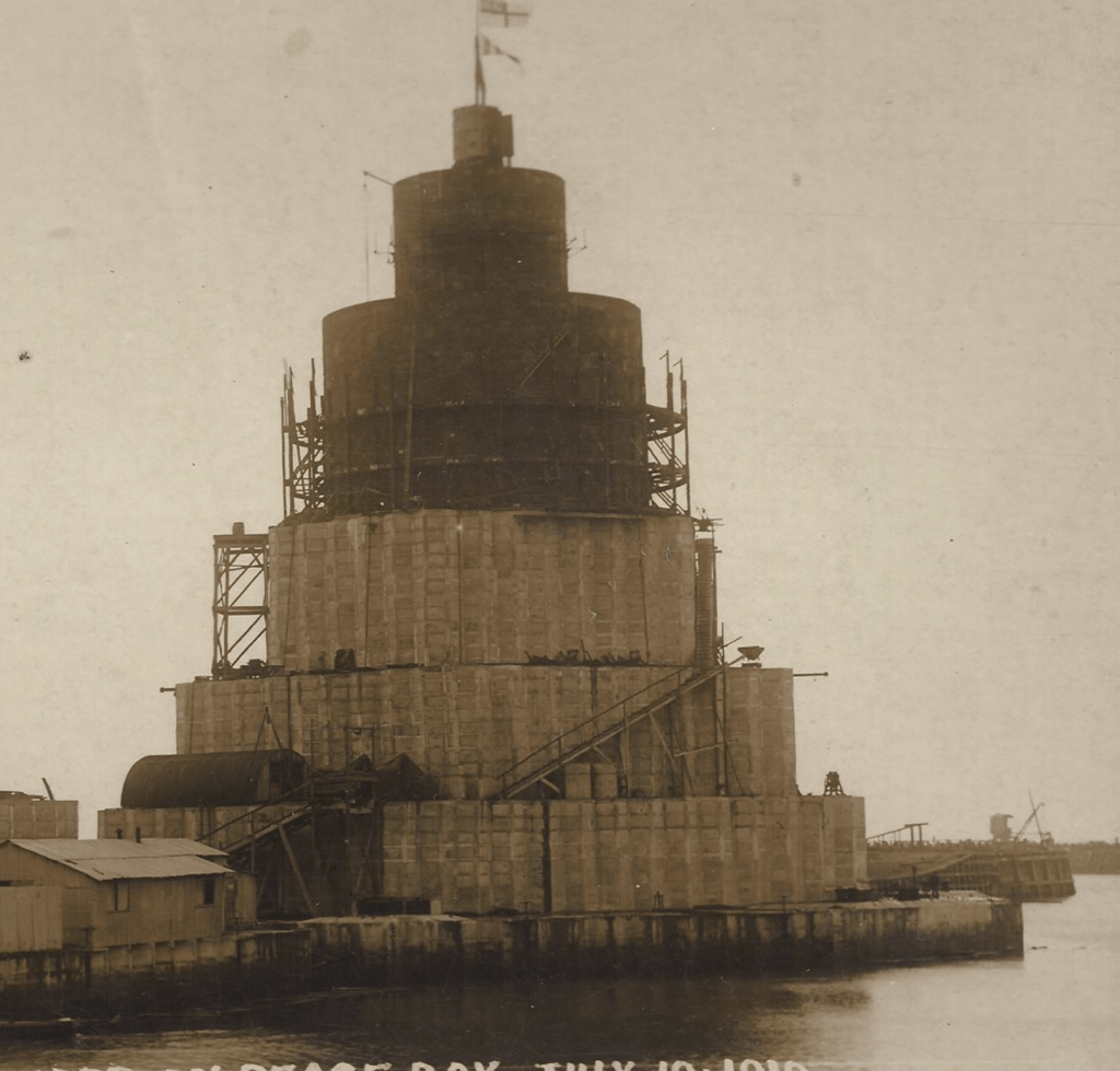 The project was cancelled in November 1918 but the Admiralty agreed to complete construction as both were near complete – as it appears in the painting. This tower, Tower 1, was removed to the Solent for re-use in September 1920. – the only time the tide would permit floating out of the harbour. In photographs the Western tower (Tower 1) has two small structures on the roof. I think Tower 1 was the only one to have two structures installed as, I speculate, that one structure was a lighthouse specific for the intended use as The Nab Tower. (see 2nd photograph below). This would suggest the painting is just before launch in September 1920.