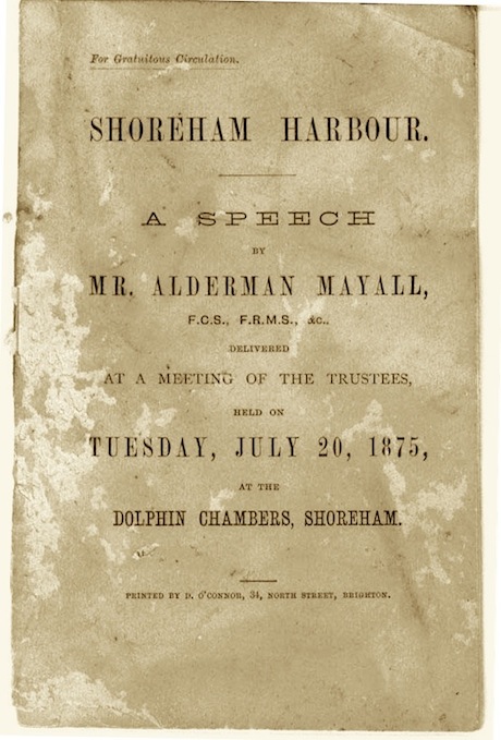 On Tuesday July 20th 1875, Alderman Mayall, having been appointed by the Brighton Corporation to be one of the trustees of the Shoreham Harbour Board, gave a speech at a meeting of the trustees at the Dolphin Chambers, Shoreham, where he laid out his plan to get a new bill passed through Government to allow the port greater borrowing powers in order to make the most of Shoreham Harbour’s potential. In the speech, he proposes that Captain Walter Wood, and Mr William Hall, be heard to make statements regarding an offer that had been made to the shareholders, and submit a draft Bill for the reconstitution of the trust, which would need the sanction of Government.