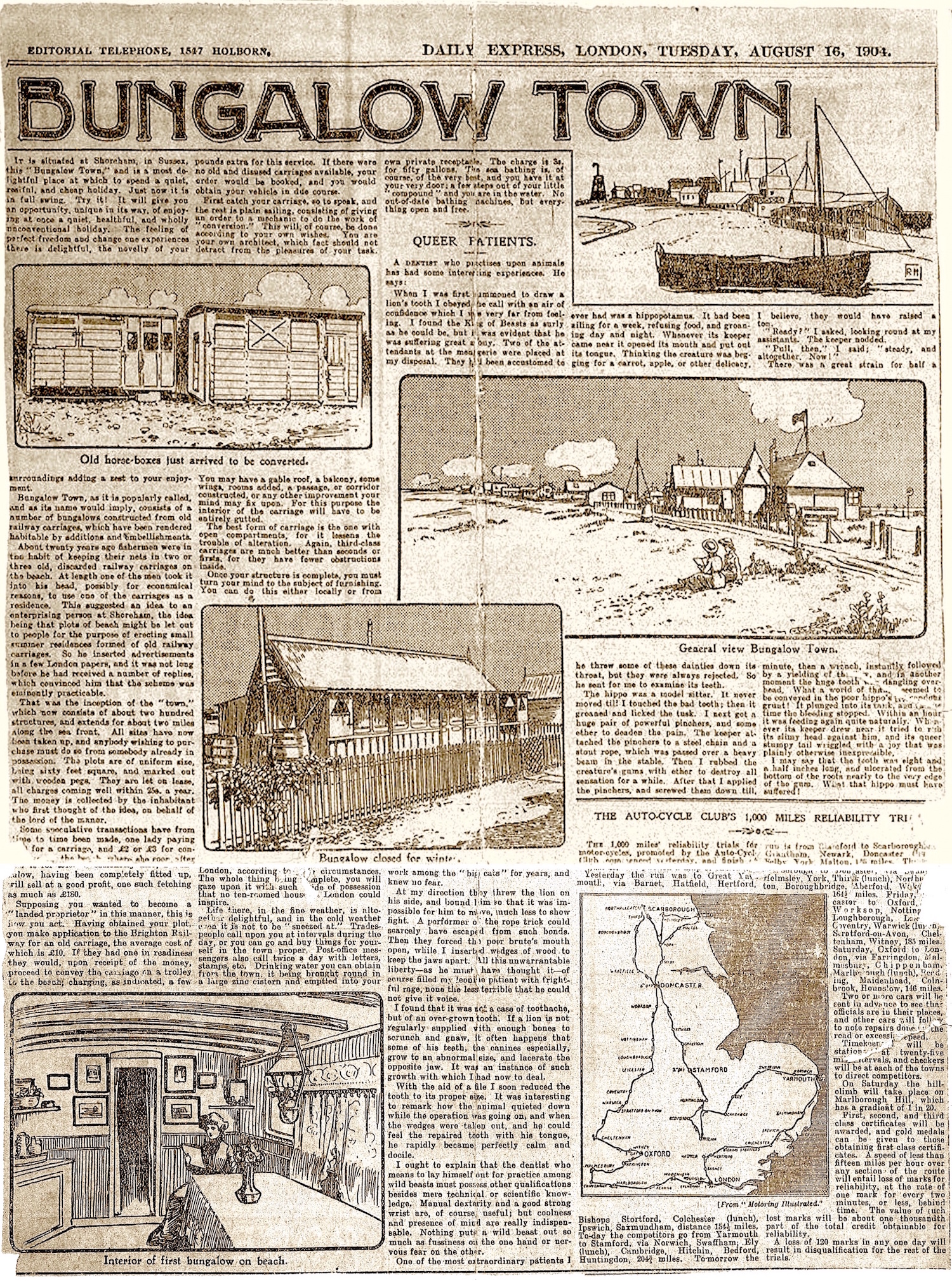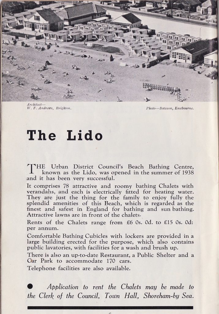 Assorted BT adverts (recent electrification of the line enabled the Leggett advert to proudly proclaim the local station to be Shoreham Electric Railway Station!)Sam Maple is given credit as the pioneer of Bungalow Town – his son became romantically involved with the widow who owned the fabulous castle-like ‘Rhodesia’ bungalow on the beach (see article http://www.shorehambysea.com/rhodesia-special-bungalow/ )What are these structures on the beach near the foot of Ferry Road? Changing huts? The writing on the sides is not legible and the guide has been noted ‘1938’ by hand on the cover and if so it was surely too early to have been air raid shelters?This well taken photo shows the Lido to have been quite a smart looking facility in its time.A rare view of the rear of Tipperary bungalow