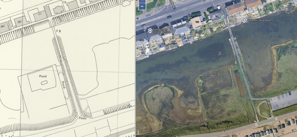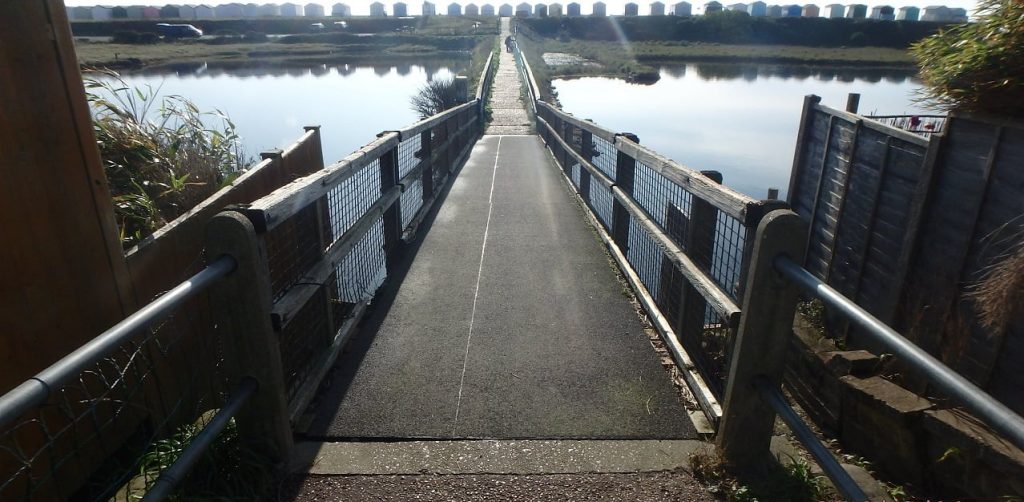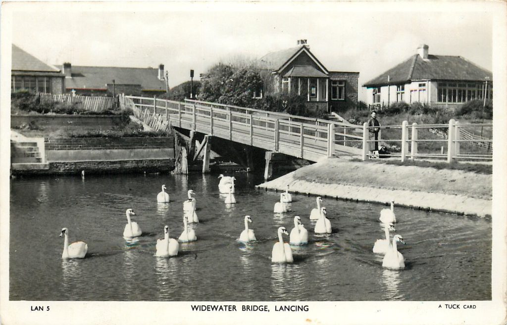 Whilst not strictly in Shoreham this small footbridge is worth a mention. Originally built to connect a ribbon of bungalows on the shore with the mainland Lancing, the Widewater bridge crossed the Widwater lagoon with a series of basic wooden trestles – with the deck elevated at the Northern end – presumably to allow small boats to go under.