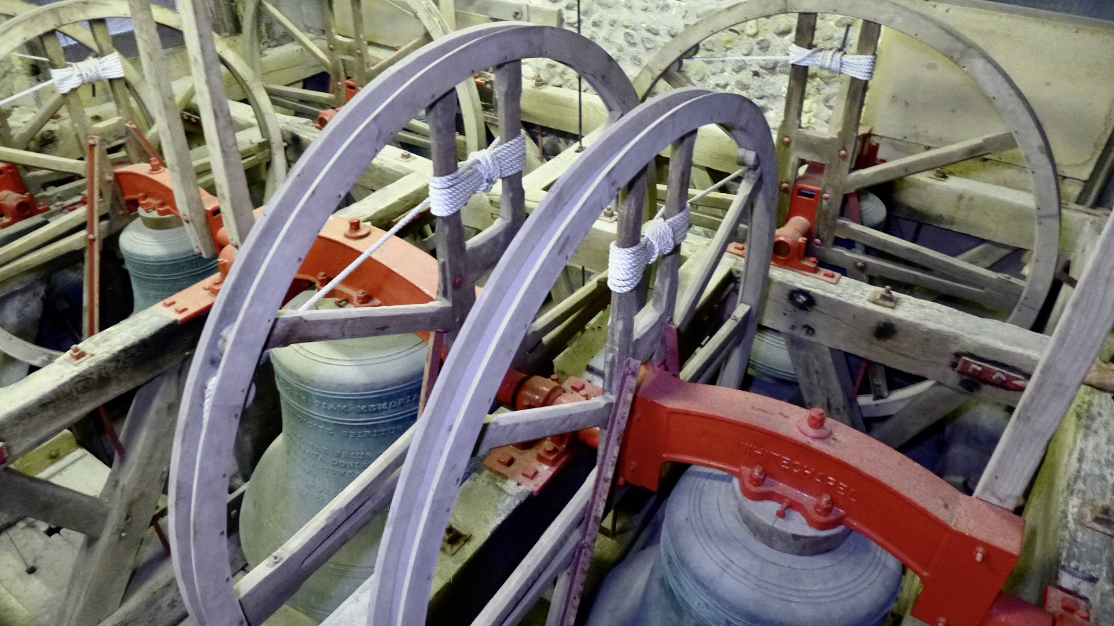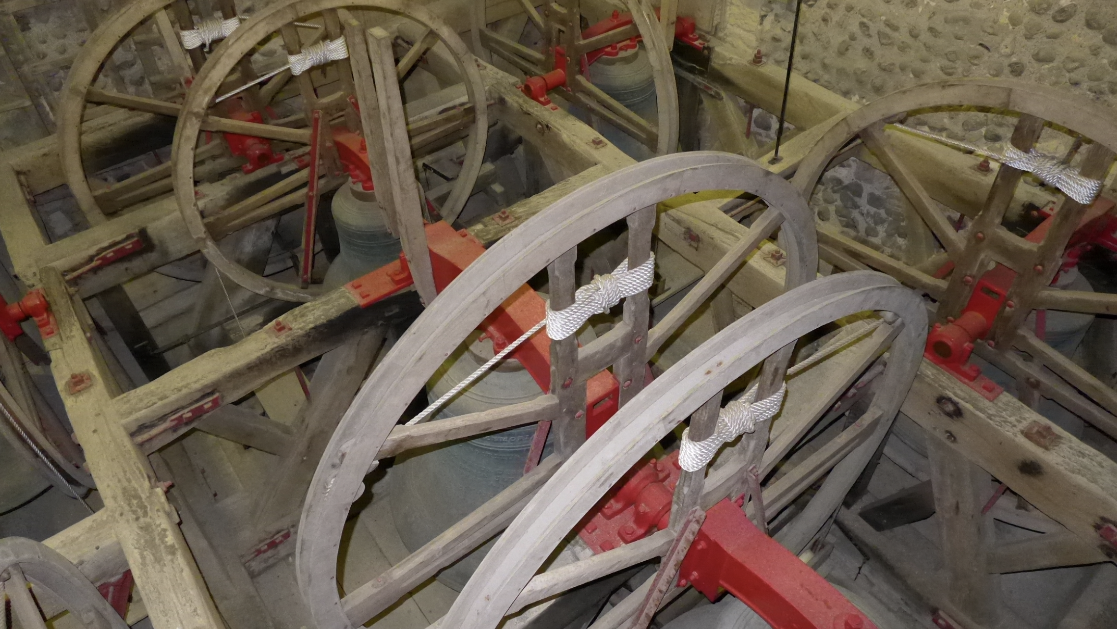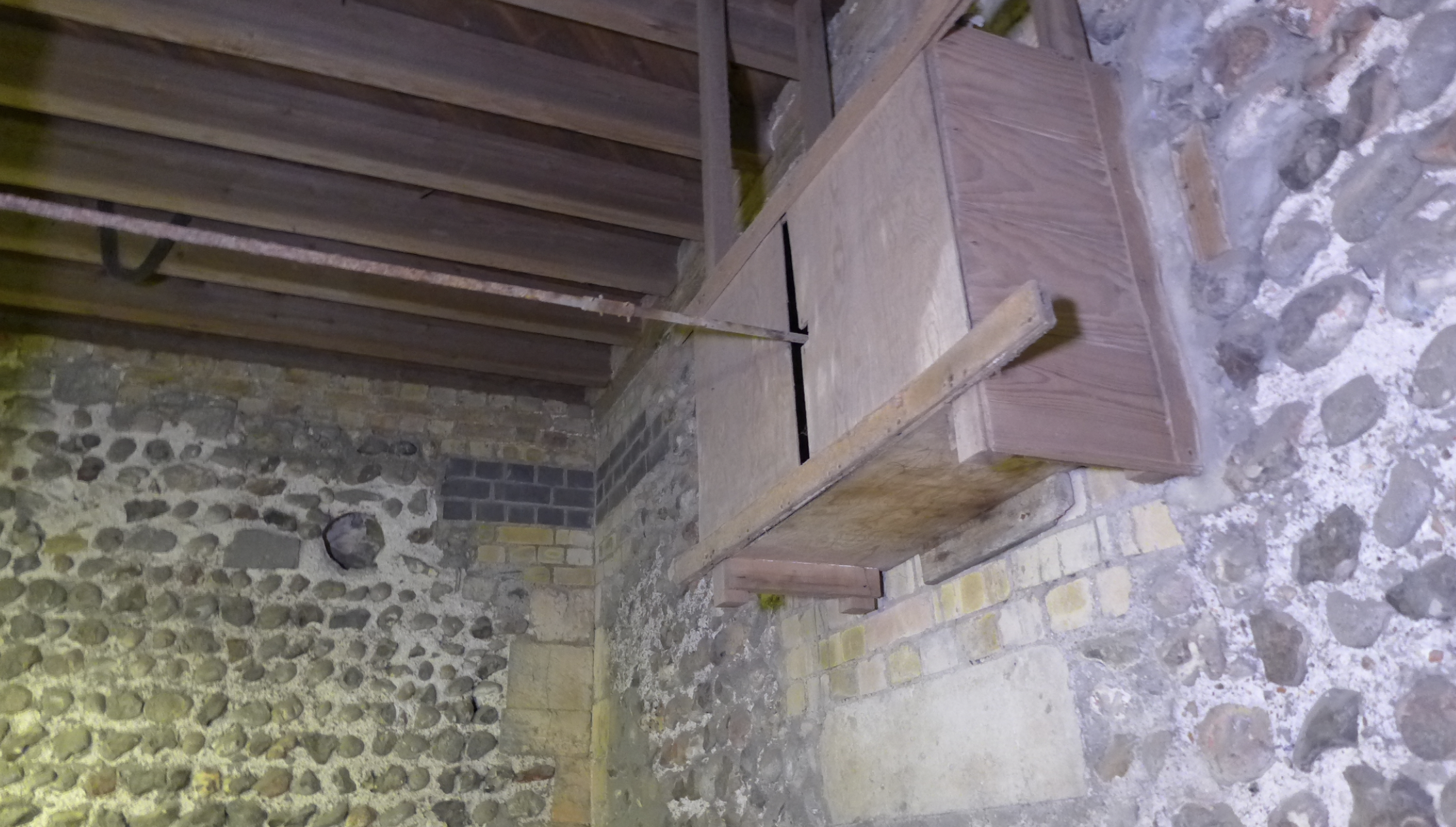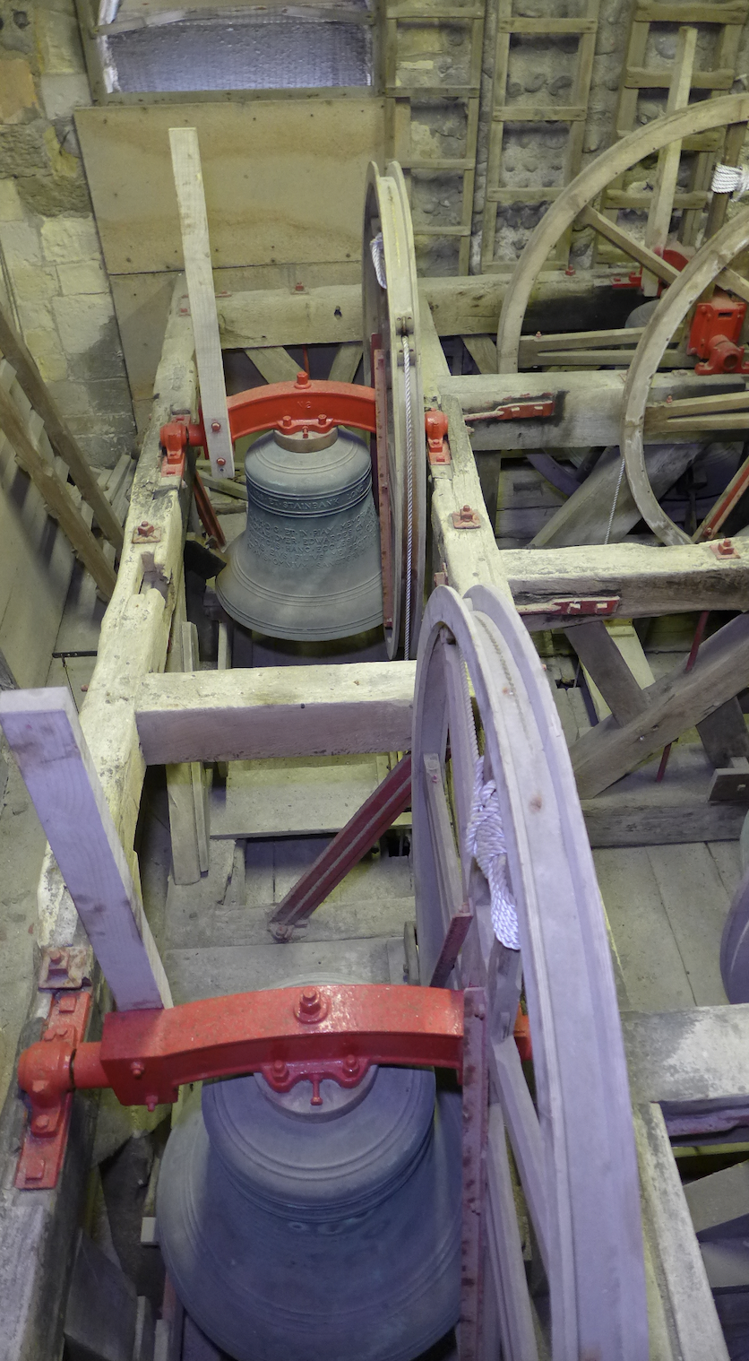The Tower was built in two stages from c1130. The video gives us a fascinating opportunity to see the constructional details of the staircase that would otherwise pass you by, and shows the distinct 2 stages. The lower stage, upto the Ringing room, is enclosed entirely inside the stone column supporting the tower. The narrower stairs in the upper stage shows evidence of numerous repairs and modifications to the structure over the previous 900 years. The upper stairs have 2 slot windows, visible from outside.